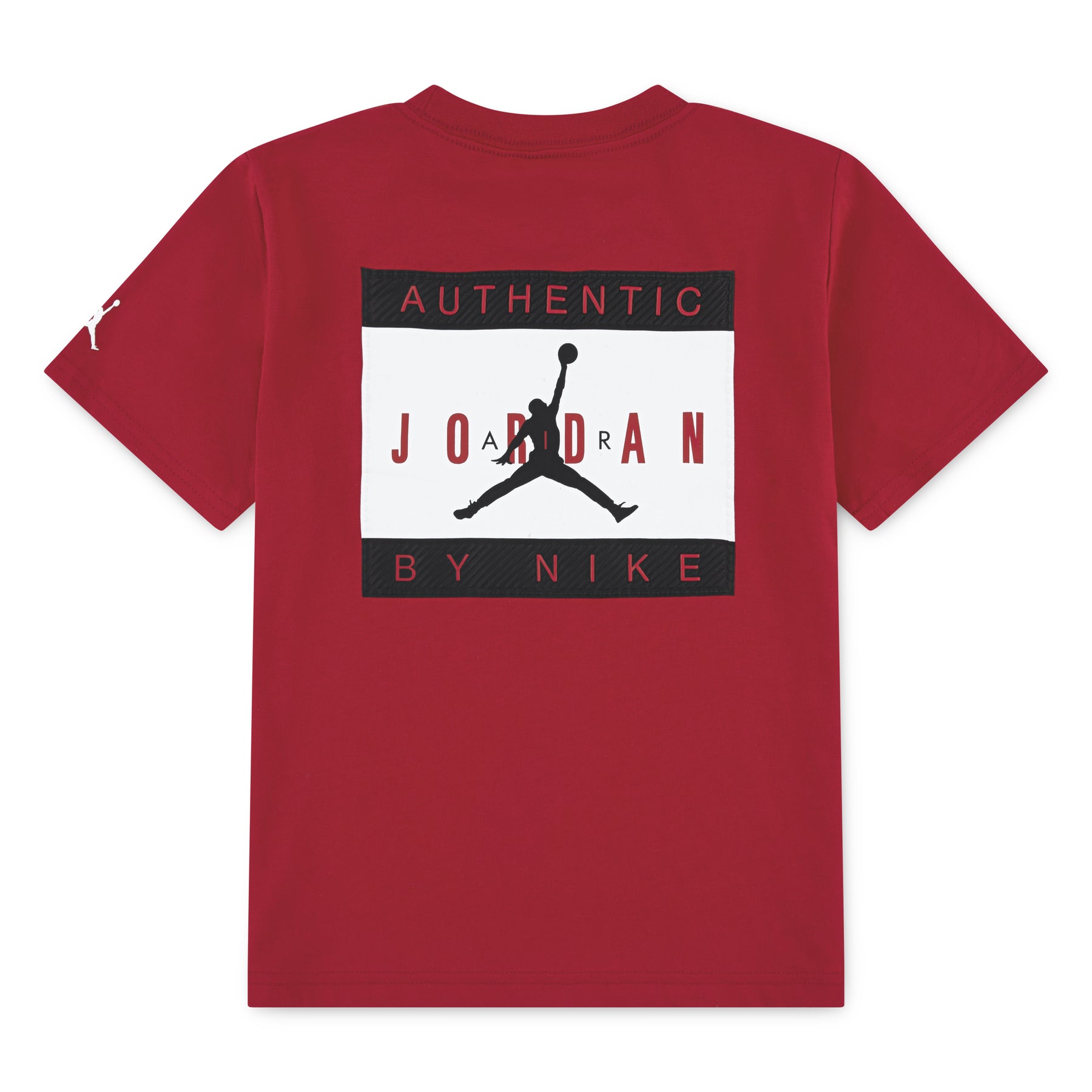 Red t-shirt for boys by Nike Kids. Made from soft cotton jersey, it features the Jumpman and Jordan print in black, white and red on the chest and back. It has the iconic Jumpman logo on one sleeve.